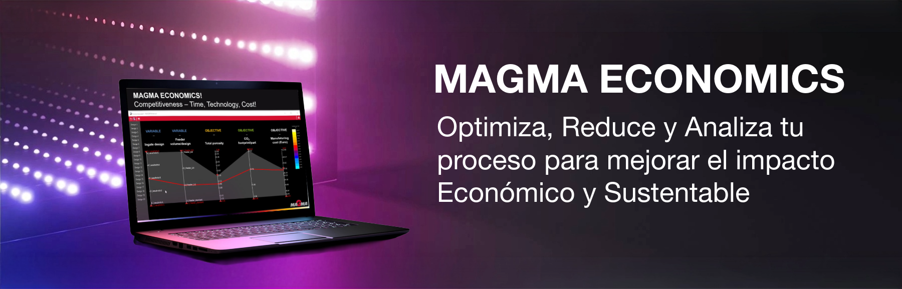 MAGMA ECONOMICS tiene en cuenta datos clave del proceso, como métricas relacionadas con el tiempo, medios de calentamiento y enfriamiento, y consumibles. Esta visión integral contribuye a mejorar la toma de decisiones.